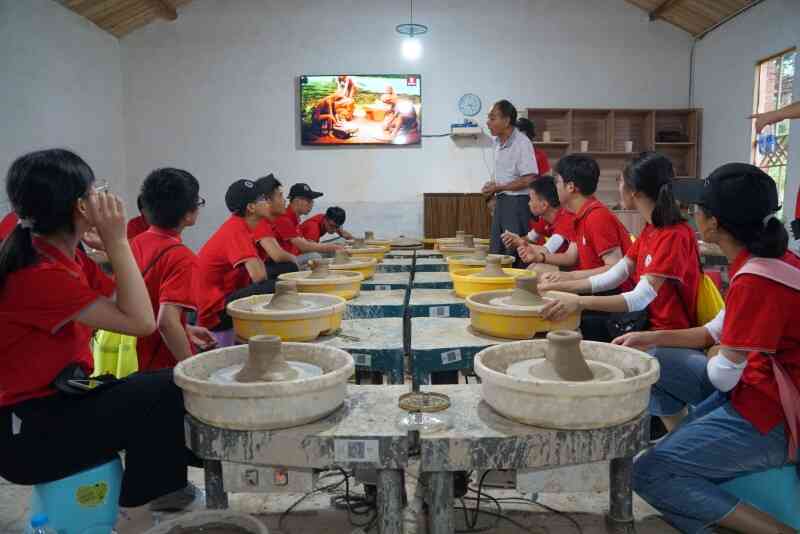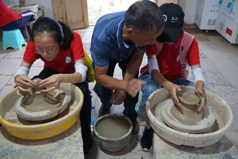 潛山市痘姆鄉(xiāng)素有“千年陶瓷之鄉(xiāng)”的美稱,陶器手工技藝距今已有6000多年的歷史,堪稱制陶史上的活化石。走進痘姆古陶,首先映入眼簾的是建于清代的龍窯,每個入火口都堆積了許多柴火,近處可感受到火的炙熱溫度。走進屋內(nèi),可見眾多精美的古陶制品擺放在木架上,富有文藝復(fù)古氣息。營員們在陶藝師傅的指導(dǎo)下,親自體驗了制胚過程,看到自己親身制作的泥坯作品展示在眼前時,無不興奮激動,這既能感受到傳統(tǒng)文化的藝術(shù)魅力,也能激發(fā)他們爭做非物質(zhì)文化遺產(chǎn)繼承人的決心。