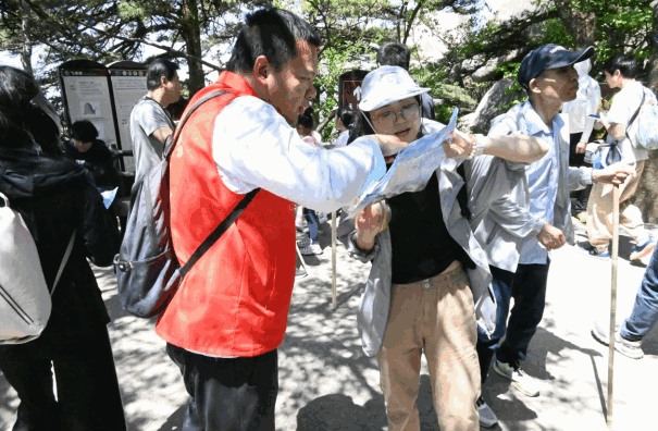 五一小長假,天柱山各級機構主動上山,志愿者在景區(qū)各個地方為游客排憂解難。在大龍窩索道游客中心,游客數(shù)量眾多,人頭攢動。他們穿著志愿者服務的小馬褂,戴著紅色志愿者的服務帽,面對游客提出的各種問題,他們仔細傾聽,耐心解釋,始終保持微笑服務。遇見行動不便和年紀偏大的游客,他們一邊提醒游客注意,一邊主動上前攙扶。